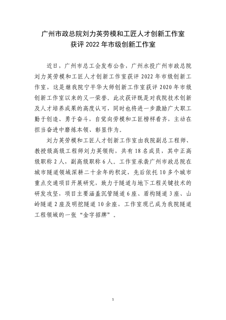 廣州市政總院劉力英勞模和工匠人才創(chuàng)新工作室獲評2022年市級創(chuàng)新工作室
