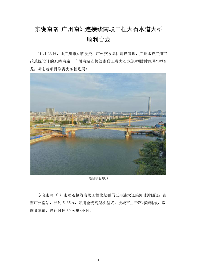 東曉南路-廣州南站連接線南段工程大石水道大橋順利合龍