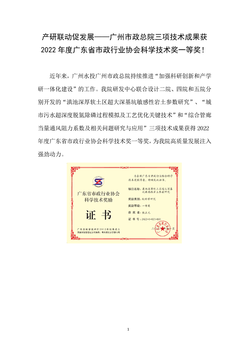 產(chǎn)研聯(lián)動促發(fā)展——廣州市政總院三項技術成果獲2022年度廣東省市政行業(yè)協(xié)會科學技術獎一等獎! 發(fā)布時間:2023-01-06閱讀次數(shù):