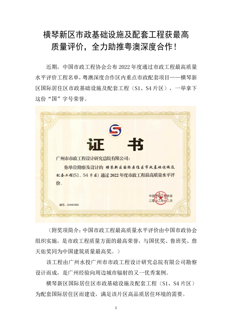橫琴新區(qū)市政基礎(chǔ)設(shè)施及配套工程獲最高質(zhì)量評(píng)價(jià),全力助推粵澳深度合作!