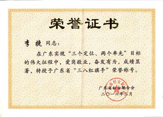 熱烈祝賀我院研發(fā)中心總工李捷被授予“廣東省三八紅旗手”榮譽(yù)稱號(hào)