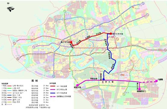 南寧市規(guī)劃8條地鐵線路,3條BRT線路,規(guī)劃形成“六橫四縱”的骨干公交網(wǎng)絡(luò);BRT作為軌道交通的補(bǔ)充、延升與聯(lián)絡(luò)。南寧BRT一號(hào)線由廣州市政總院參與設(shè)計(jì),于2016年12月試運(yùn)營,目前日均客流量達(dá)13.2萬人次,全程行駛時(shí)間較開通前減少了38%,整體運(yùn)營情況良好。