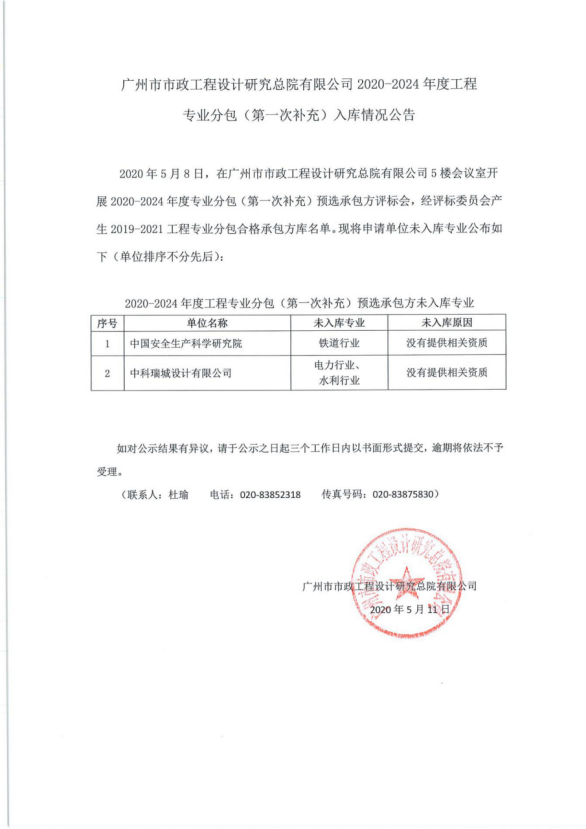 2020-2024年度專業(yè)分包(第一次補錄)入庫情況公告