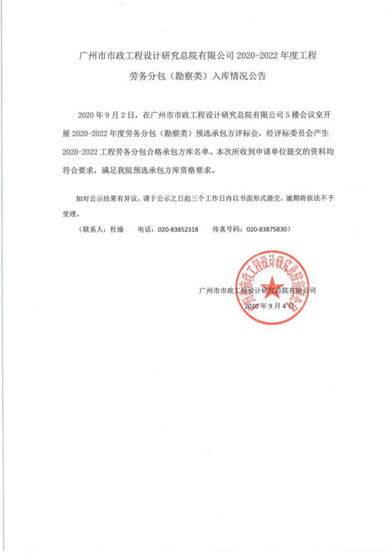 2020-2022年度工程勞務(wù)分包(勘察類)入庫(kù)情況公告