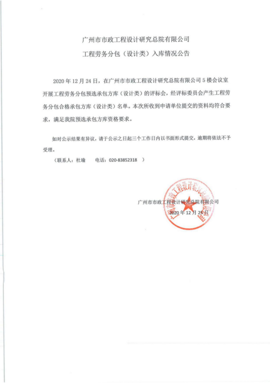工程勞務(wù)分包(設(shè)計(jì)類)入庫情況公告