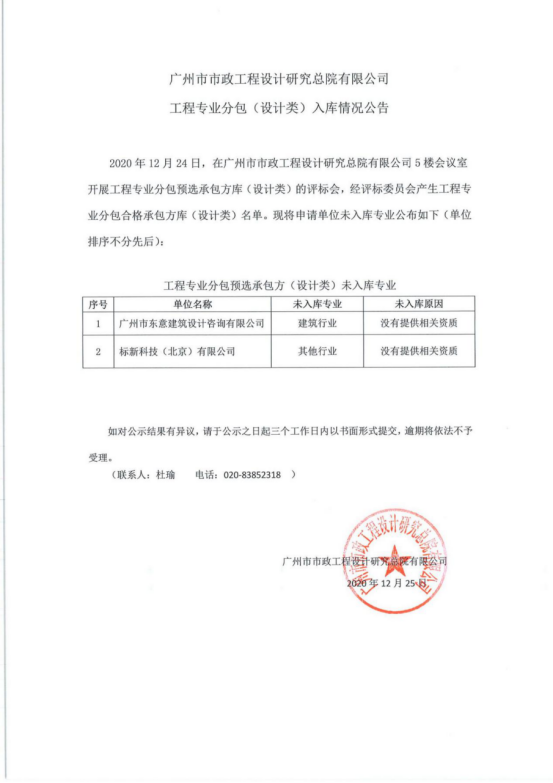 工程專業(yè)分包(設(shè)計(jì)類)入庫情況公告