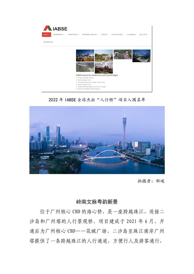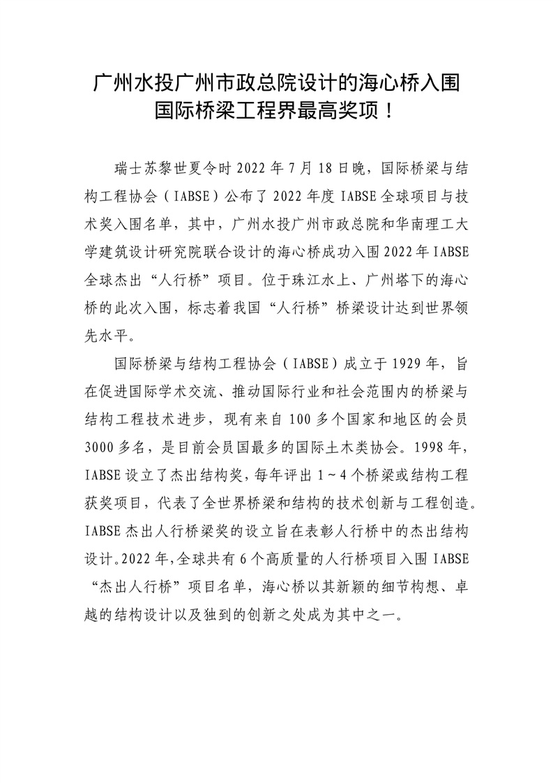 廣州水投廣州市政總院作品海心橋入圍國際橋梁工程界最高獎項