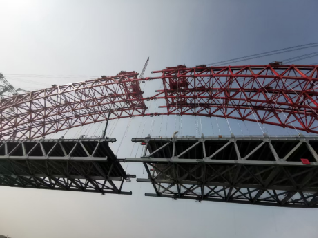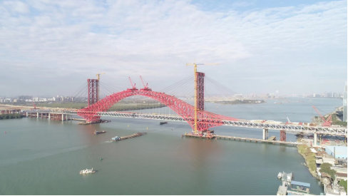 設(shè)計一院第二黨支部 我院設(shè)計的明珠灣大橋主跨鋼桁拱拱肋開始合龍