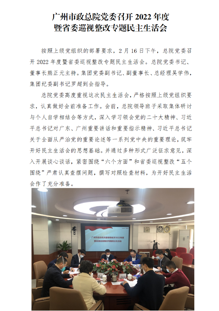 廣州市政總院黨委召開2022年度暨省委巡視整改專題民主生活會(huì)