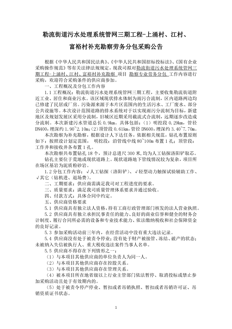 采購公告發(fā)布-勒流街道污水處理系統(tǒng)管網(wǎng)三期工程-上涌村、江村、富裕村補(bǔ)充勘察勞務(wù)分包 發(fā)布時(shí)間:2022-11-24閱讀次數(shù):