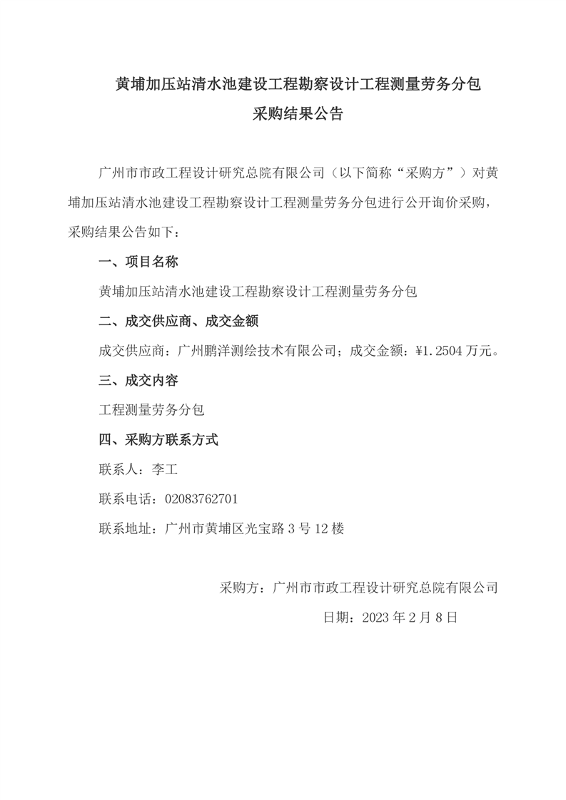 采購結果公告-黃埔加壓站清水池建設工程勘察設計工程測量勞務分包