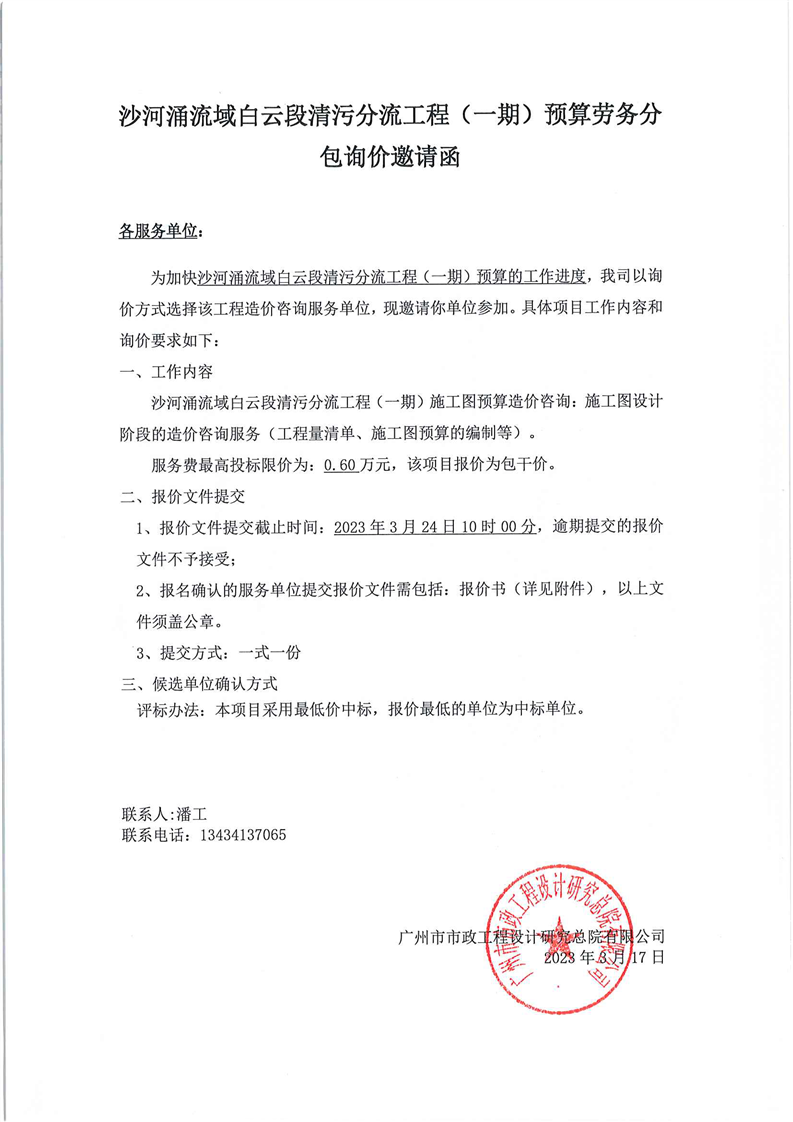 沙河涌流域白云段清污分流工程(一期)預算專業(yè)分包詢價邀請函