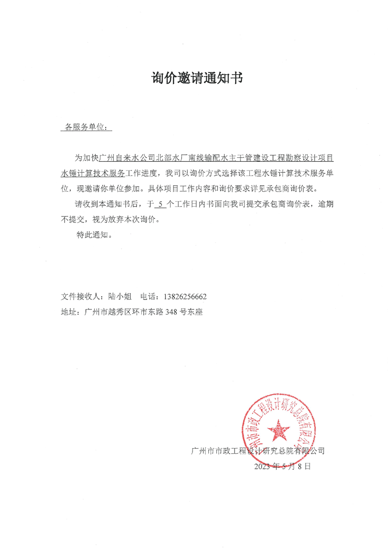 廣州自來水公司北部水廠南線輸配水主干管建設(shè)工程勘察設(shè)計(jì)項(xiàng)目水錘計(jì)算技術(shù)服務(wù)采購 發(fā)布時(shí)間:2023-05-08閱讀次數(shù):
