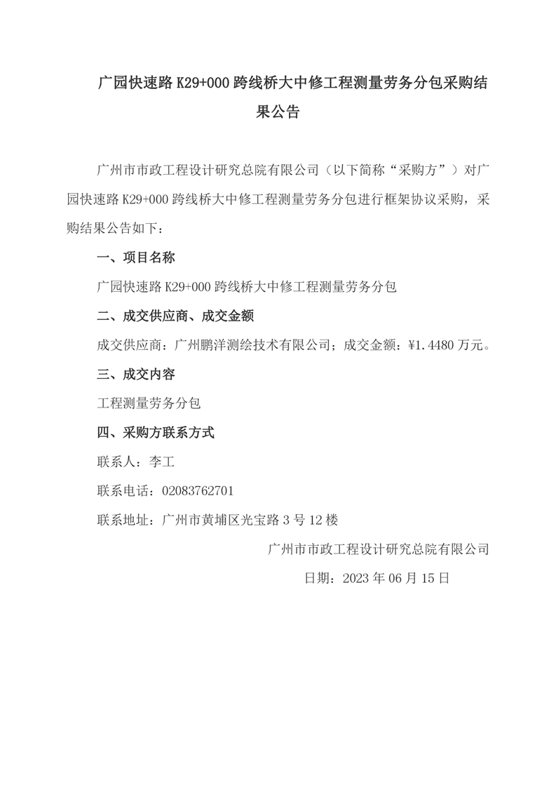 廣園快速路K29+000跨線橋大中修工程測(cè)量勞務(wù)分包采購(gòu)結(jié)果公告