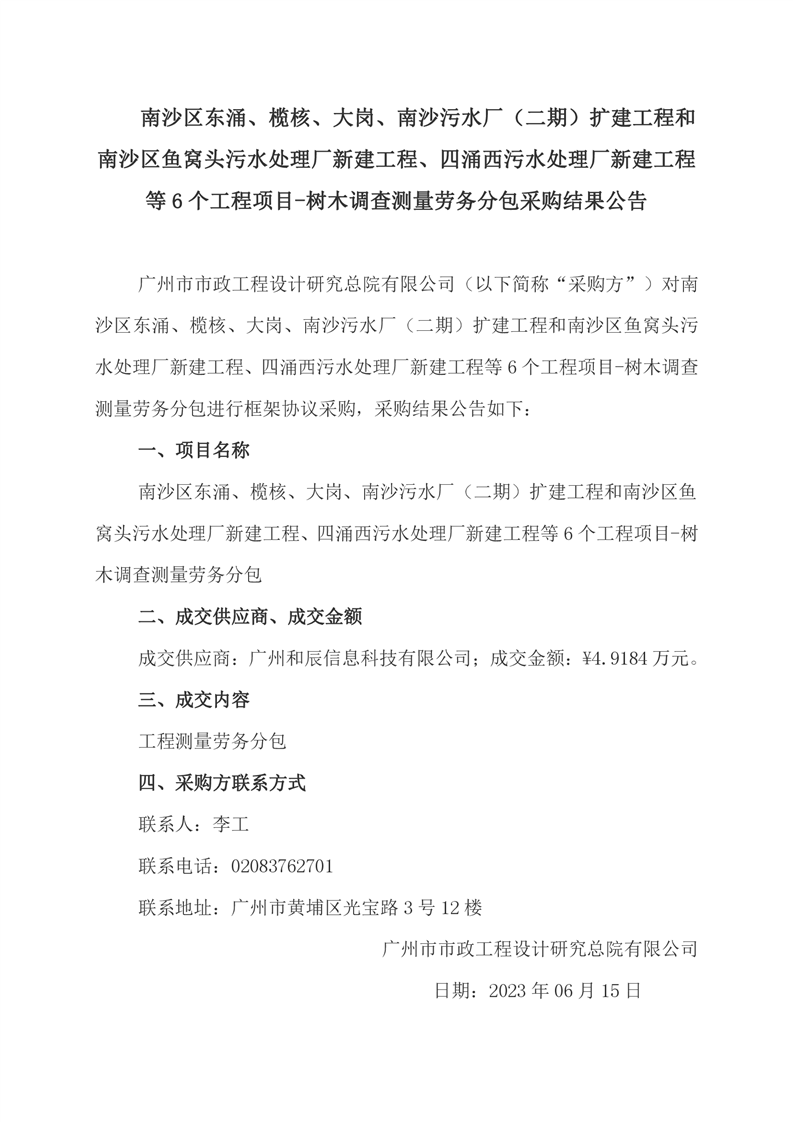 南沙區(qū)東涌、欖核、大崗、南沙污水廠(二期)擴(kuò)建工程和南沙區(qū)魚(yú)窩頭污水處理廠新建工程、四涌西污水處理廠新建工程等6個(gè)工程項(xiàng)目-樹(shù)木調(diào)查測(cè)量勞務(wù)分包采購(gòu)結(jié)果公告 發(fā)布時(shí)間:2023-06-15閱讀次數(shù):