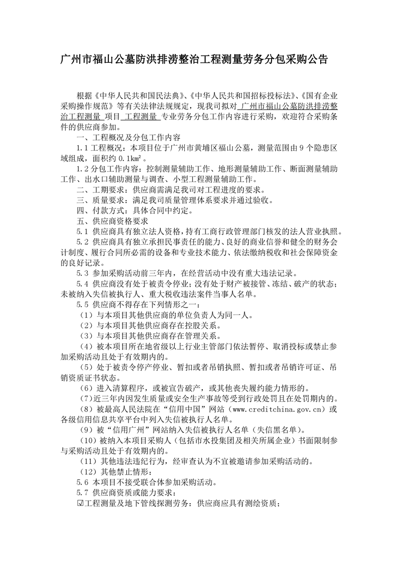采購公告發(fā)布-廣州市福山公墓防洪排澇整治工程測(cè)量勞務(wù)分包