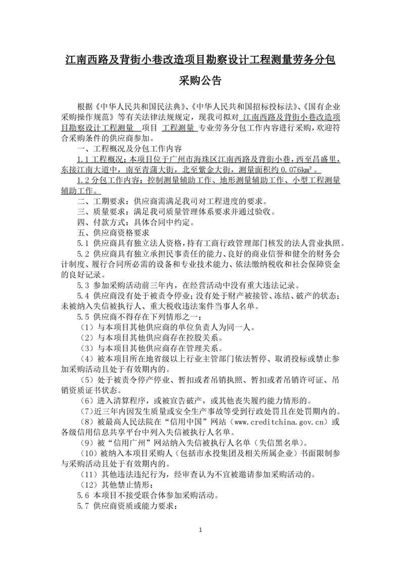 采購公告發(fā)布-江南西路及背街小巷改造項(xiàng)目勘察設(shè)計(jì)工程測(cè)量勞務(wù)分包