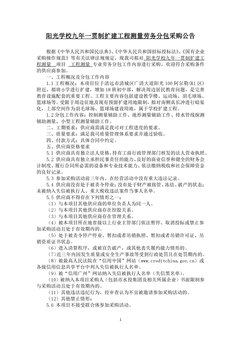 采購公告發(fā)布-陽光學(xué)校九年一貫制擴建工程測量勞務(wù)分包