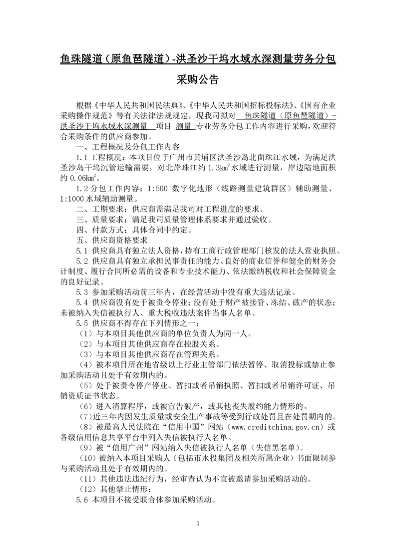 采購(gòu)公告發(fā)布-魚(yú)珠隧道(原魚(yú)琶隧道)-洪圣沙干塢水域水深測(cè)量勞務(wù)分包