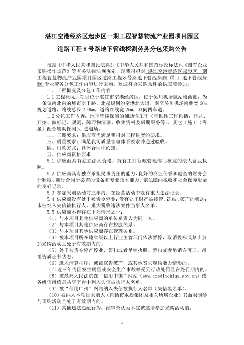 采購(gòu)公告發(fā)布-湛江空港經(jīng)濟(jì)區(qū)起步區(qū)一期工程智慧物流產(chǎn)業(yè)園項(xiàng)目園區(qū)道路工程8號(hào)路地下管線探測(cè)勞務(wù)分包 發(fā)布時(shí)間:2022-11-09閱讀次數(shù):