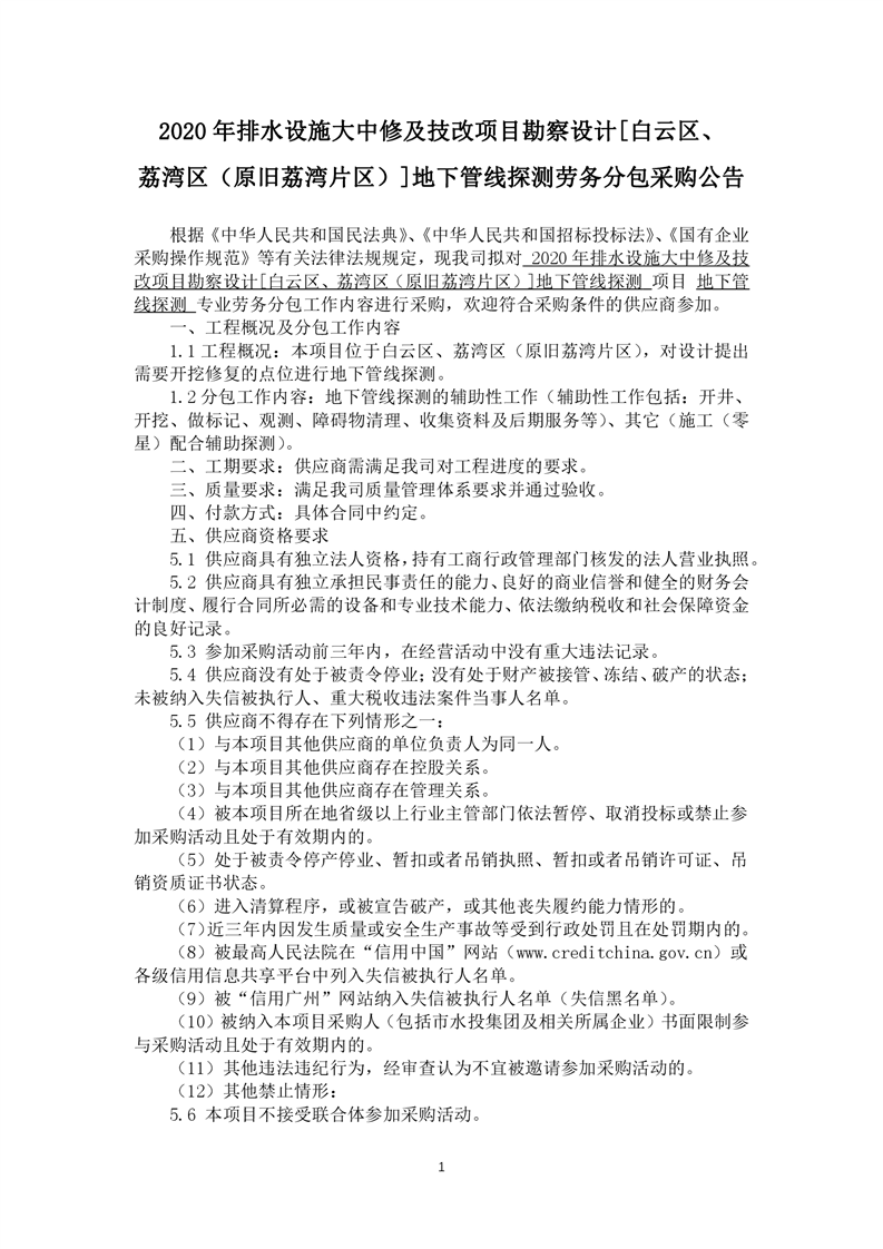 采購公告發(fā)布-2020年排水設(shè)施大中修及技改項(xiàng)目勘察設(shè)計(jì)[白云區(qū)、荔灣區(qū)(原舊荔灣片區(qū))]地下管線探測勞務(wù)分包 發(fā)布時(shí)間:2022-11-24閱讀次數(shù):